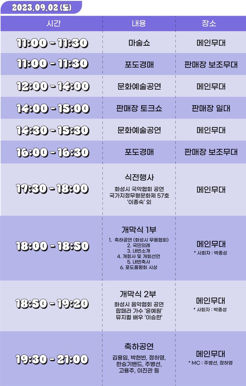 2023년 화성송산 포도축제 일정표는 다음과 같습니다.